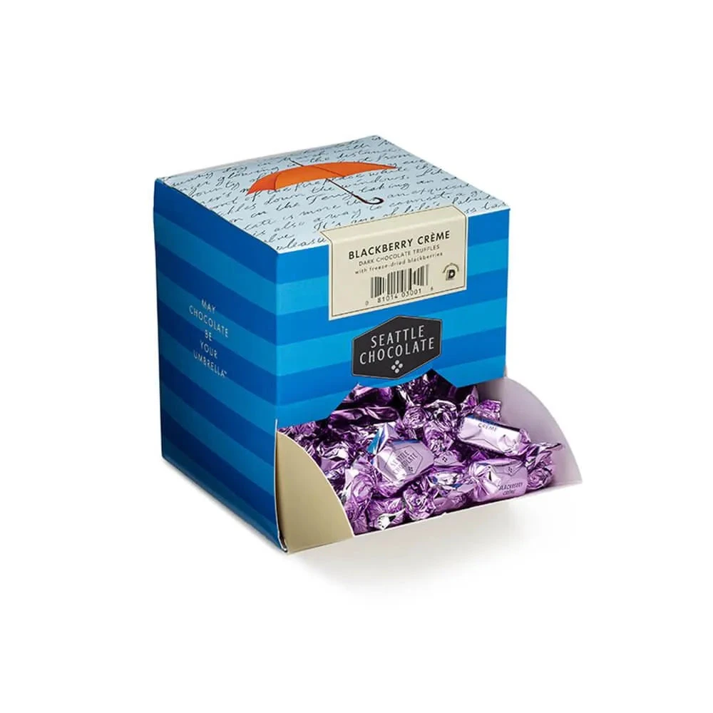 Box contains 2 pounds of Pink Foil Wrapped Blackberry Creme Truffles… that’s about 96 pieces.
