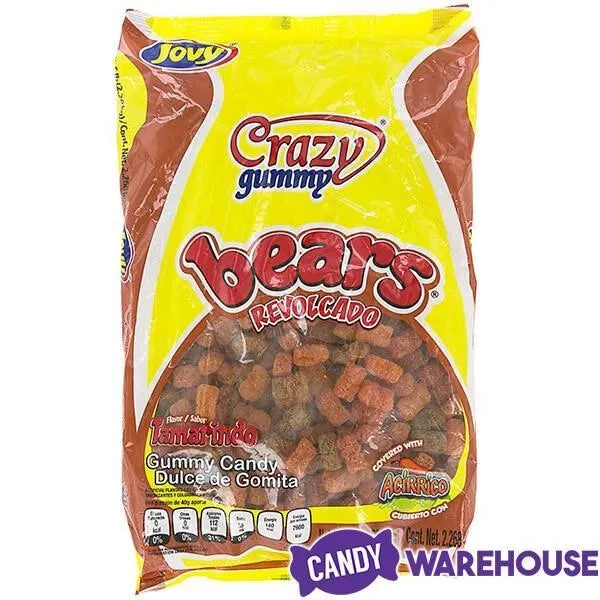 Bag contains 5 pounds of Jovy Crazy Gummy Bears Revolcado Tamarindo Candy.