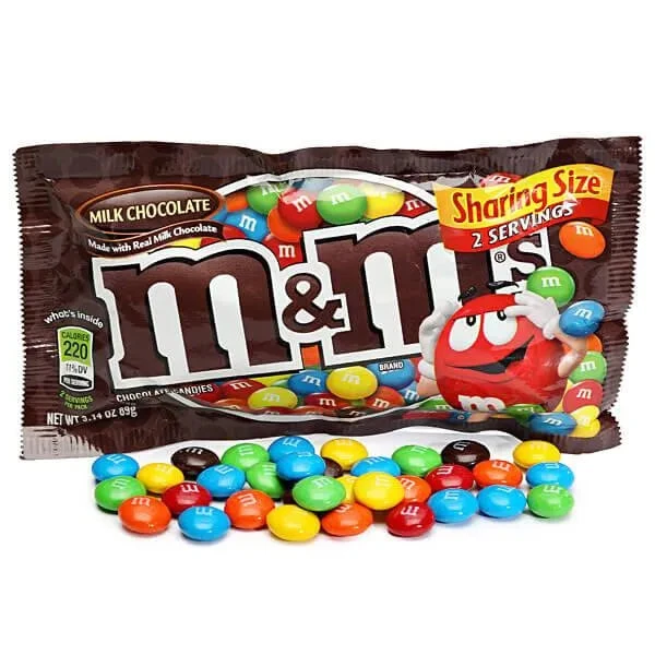 Display box contains 24 Plain M&M’s Candy Packs, each with a net weight of about 3 ounces.