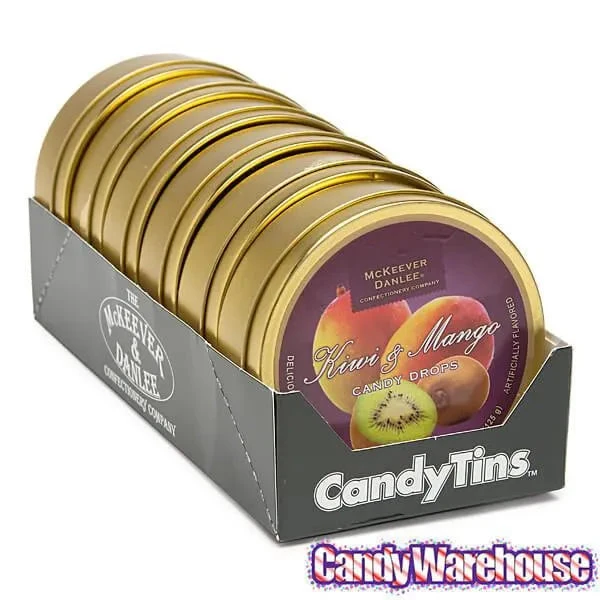 Display box contains 6 McKeever & Danlee Mango & Kiwi Candy Bon Bons Tins, each with a net weight of 4.4 ounces.