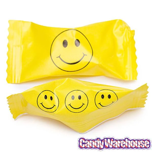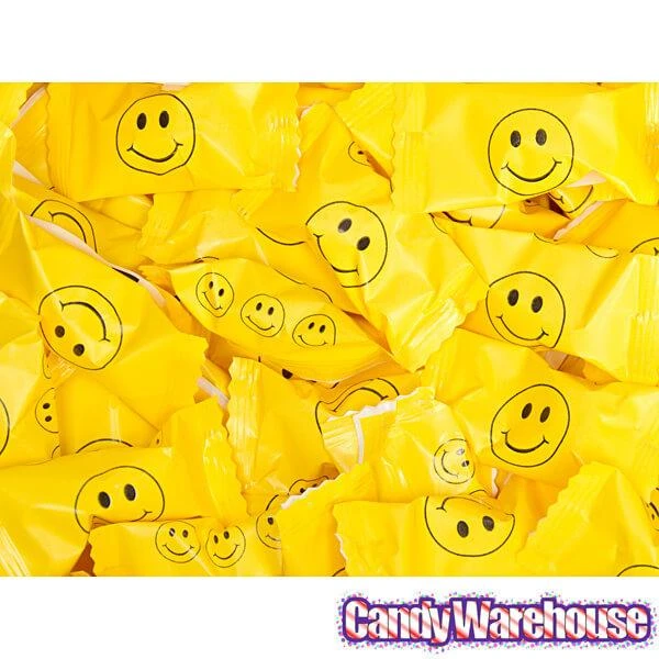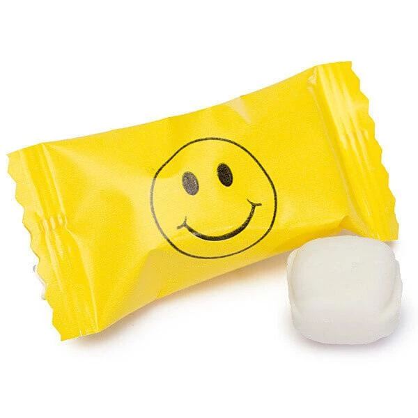 Light and airy buttermints featuring yellow smiley face wrapper designs!