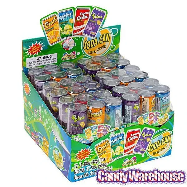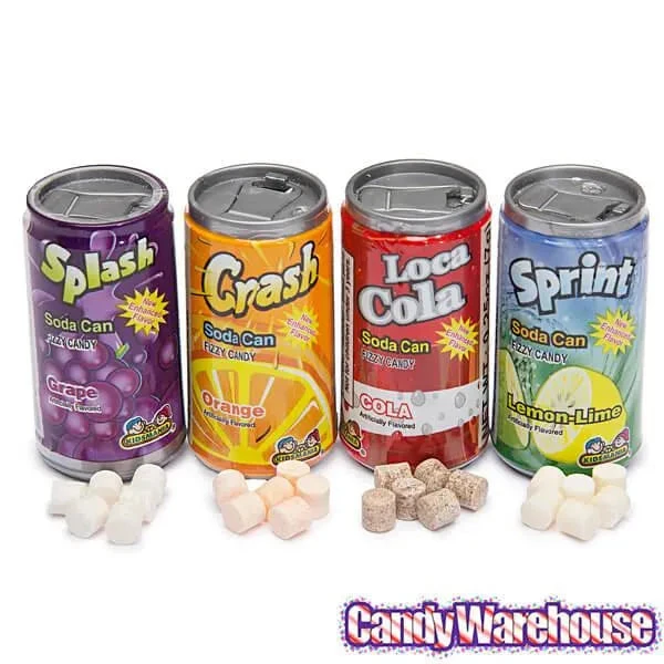 Delicious soda-flavored fizzy candy packaged in mini soda cans!